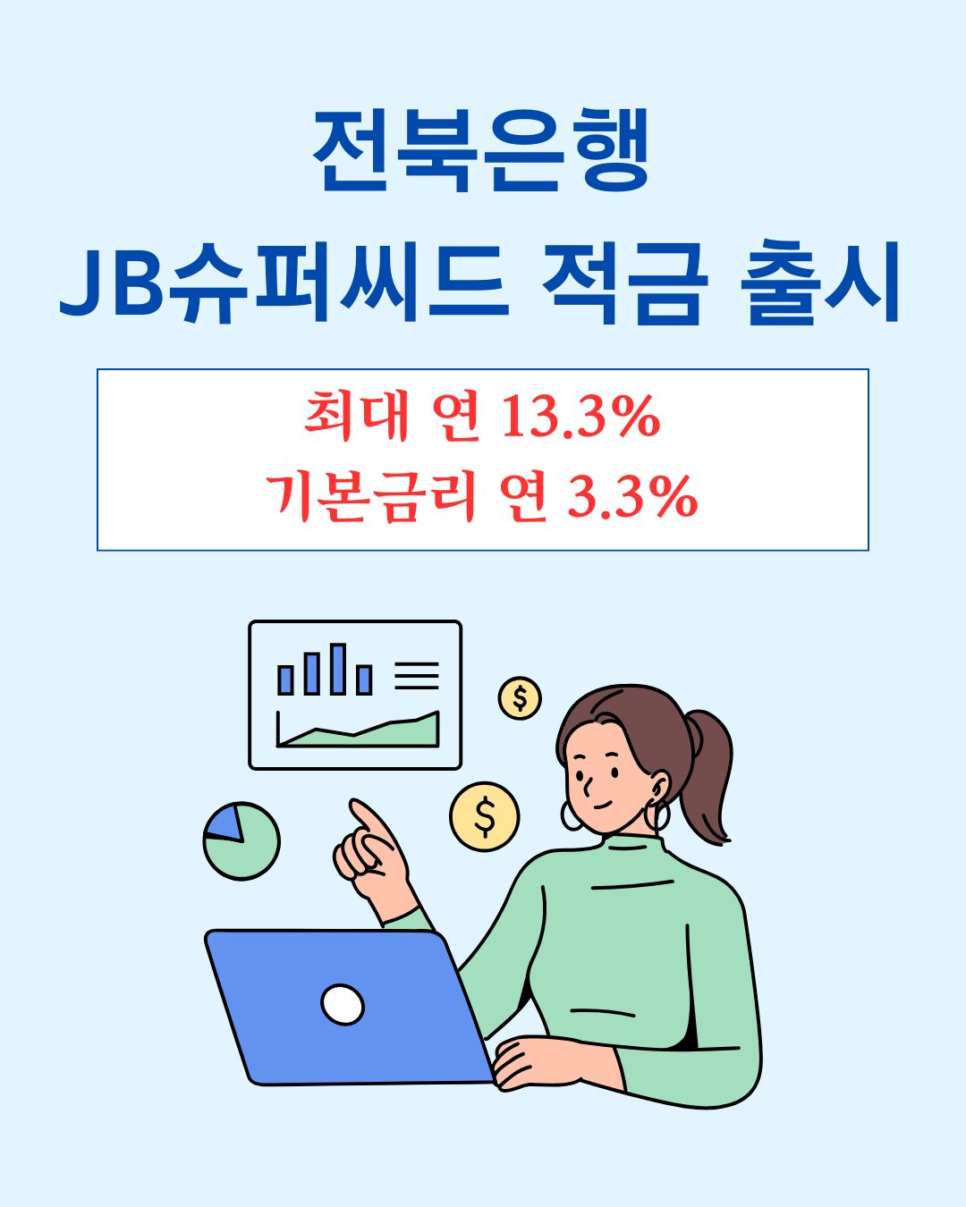 'JB 슈퍼씨드 적금'은 디지털 전용 정기적금 상품으로, 기본 금리에 더해 이벤트를 통해 최대 연 13.3%의 고금리를 제공하는 것이 특징입니다. 전북은행의 캐릭터인 '제이비(Jay-B)'가 씨드를 가져다준다는 콘셉트로, 꾸준한 저축습관을 가진 고객에게 더 높은 금리 혜택을 제공하는 것이 특징입니다. 이상품의 특징은 매월 자동 생성되는 '씨드'를 통해 '슈퍼씨드'에 당첨되면 10%의 우대금리가 추가로 적용 되어 연 13%의 금리를 받을 수 있습니다. 당첨 확률은 0.2%로 낮지만, 만기까지 총 11번의 당첨 기회가 주어집니다. 단, 씨드를 확인하지 않으면 우대금리가 적용되지 않으므로 주의가 필요합니다. 이러한 시스템은 저축에 재미와 동기를 부여하며, 높은 금리를 받을 수 있는 기회를 제공합니다. 이자수익 예시(세전 기준) 월 10만 원 납입 시: 기본 금리(3.3%) 적용 약 18,147원. 슈퍼 씨드 당첨 시(13.3%) 약 258,000원. 이벤트 기간은 2023년 10월 5일부터 2025년 12월 31일까지.