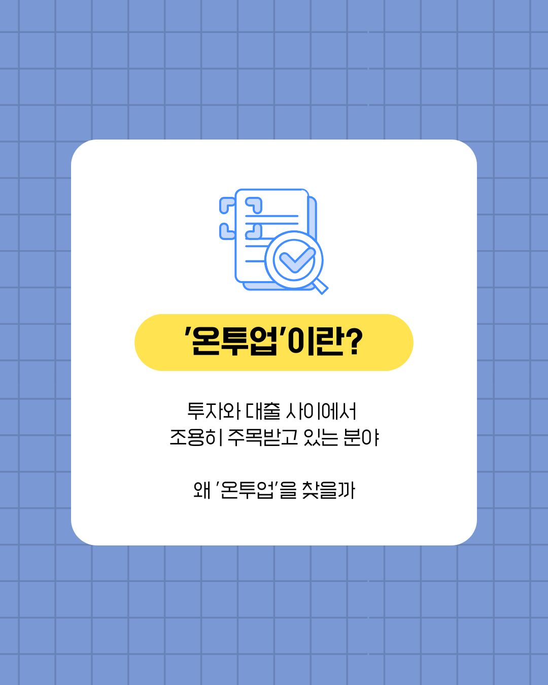 '온투업'은 온라인투자연계금융업의 줄임말로, 쉽게 말해 '돈이 필요한 사람과'과 '투자하고 싶은 사람'을 온라인 플랫폼에서 직접 연결해 주는 서비스입니다. 온라인 플랫폼에서 개인투자자와 대출자 사이의 거래로 훨씬 간결하고 빠른 구조죠. 2020년부터 '법제화'되어 금융당국의 인가를 받은 합법적인 금융업 종이 되었습니다. 투자자의 입장에서는 일정 금액을 투자해서(소액도 가능), 다양한 채권(부동산/기업/개인신용 등)에 분산 투자가 가능합니다. 대출자 입장에서는 은행보다 빠르게 자금을 빌릴 수 있고, 사업자금이나 단기 운전자금 등 개인신용대출도 가능한 플랫폼인 거죠. 금리는 은행처럼 까다롭지는 않아도 대출자의 상황이나 대출의 종류, 리스크의 정도에 따라 각 플랫폼의 자체 신용평가 모델이나 AI 알고리즘으로 정해지게 됩니다. 담보가 있다면 더 낮은 금리가 적용 가능하고, 투자자가 많은 대출의 종류라면 낮은 금리로 이용이 가능하겠죠.